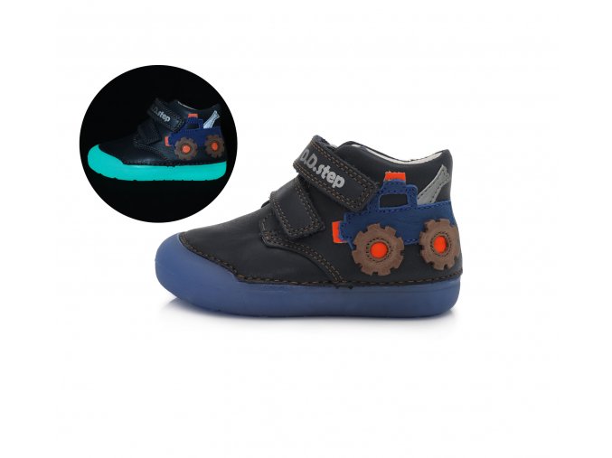 Barefoot kožené topánky D.D.step. Majú flexibilnú gumenú fluorescentnú (svietiacu) podrážku a reflexné prvky. Zvršok je vyrobený z vysokokvalitnej kože, ktorá zabezpečuje flexibilitu, priedušnosť a prispôsobuje sa tvaru detskej nožičky. Topánky majú vyberateľné ortopedické vložky.